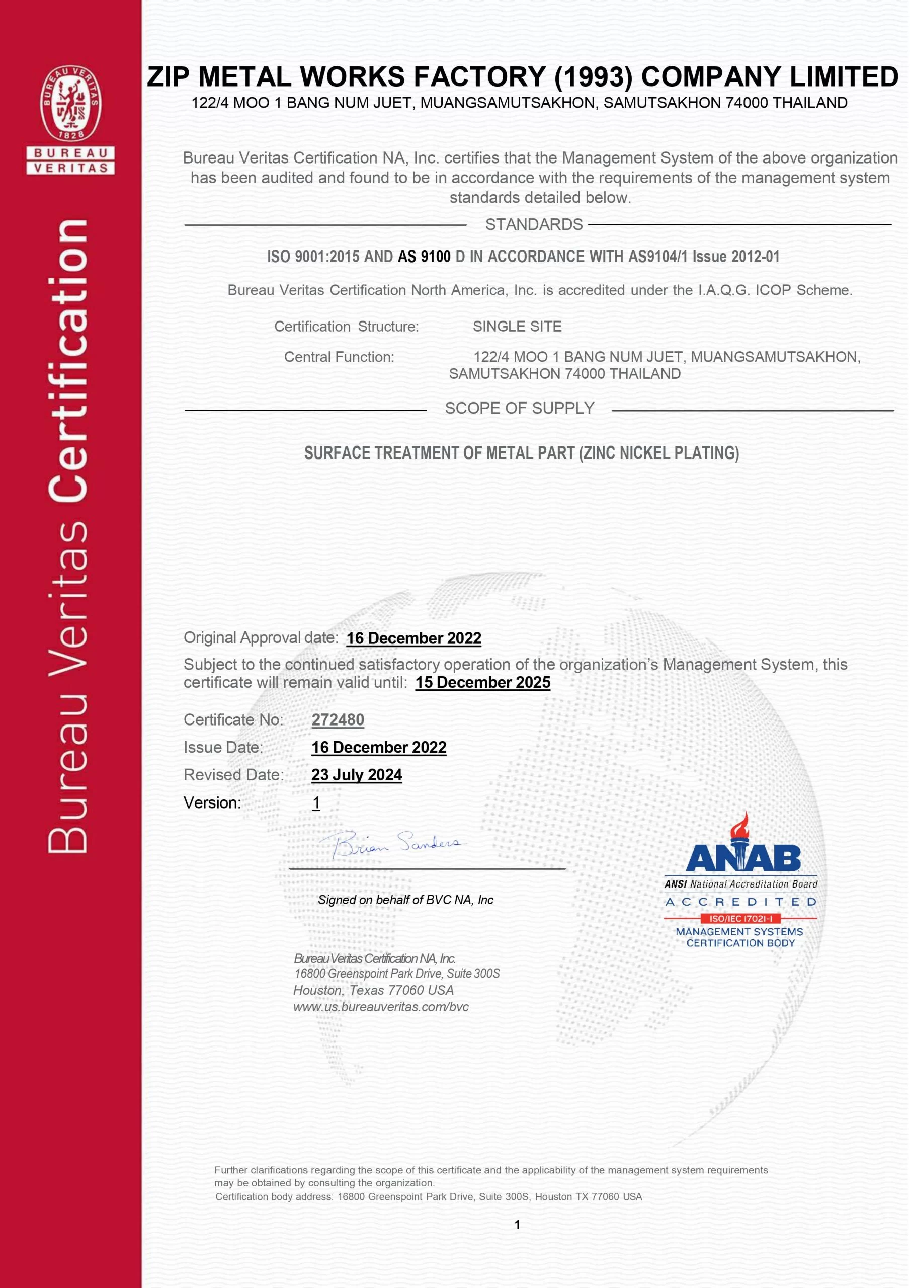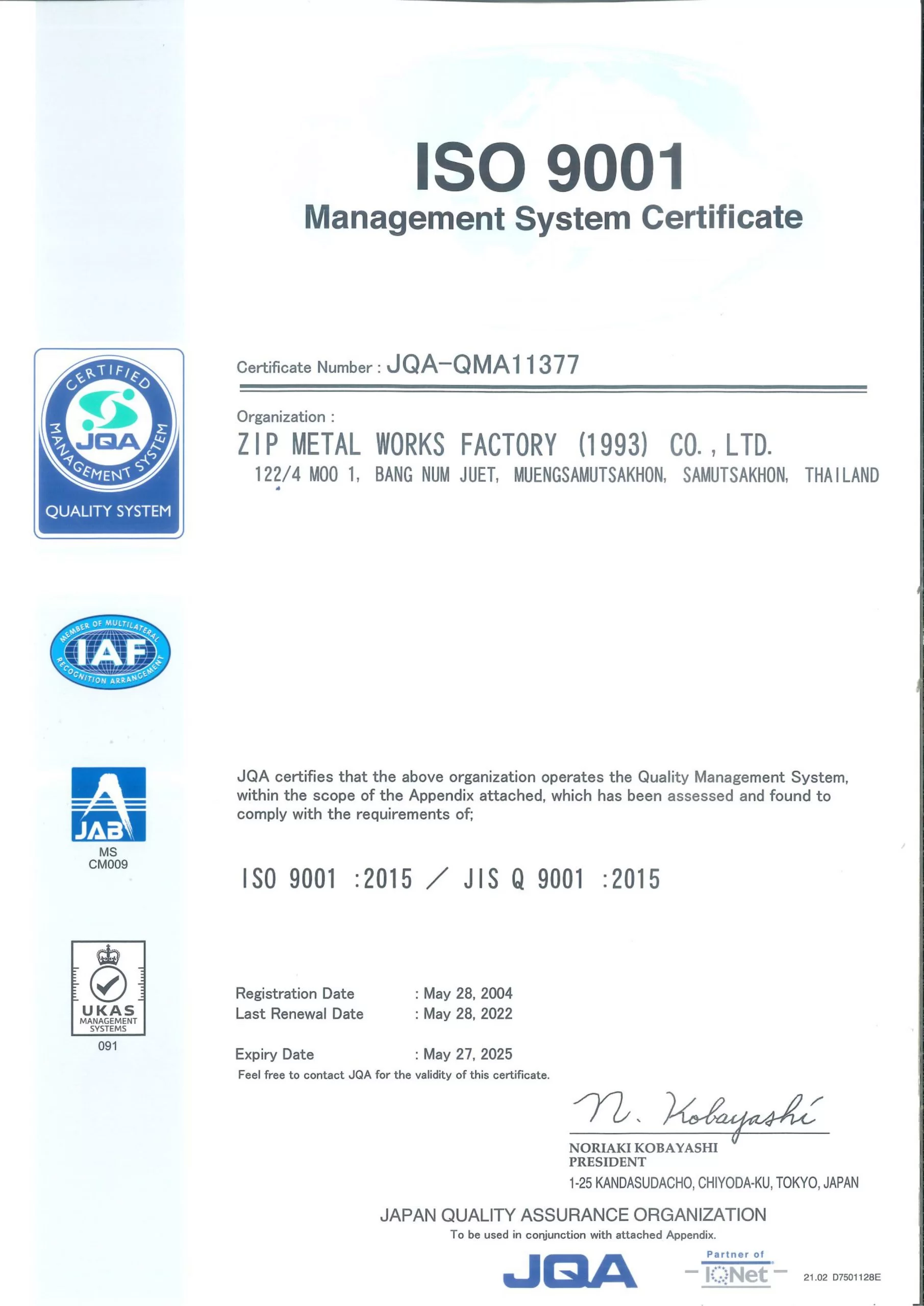 Zip Metal Work (1993) Company Limited is dedicated to developing and guaranteeing the quality of customer product. In order to meet the standard from customers, the company has inspected, measured, analyzed and controlled quality with a variety of tools. In order for customers to receive the highest quality products And has received ISO9001 quality system certification to meet customer needs.